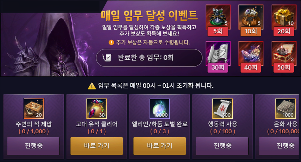 다양한 아이템을 획득할 수있는 이벤트로 임무 누적 달성 횟수에 따라 추가 보상도